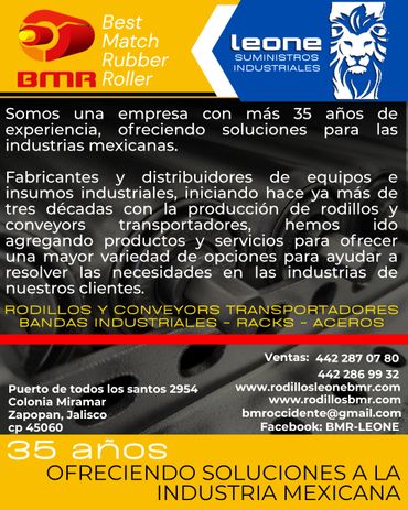 Rodillos BMR es una empresa mexicana con más de 30 años de experiencia, pionera en la fabricación de todo tipo de rodillos metálicos y recubiertos, transportadores conveyors por gravedad y automatizados y esponja etiquetadora.( fabricación de rodillos transportadores metálicos y recubiertos,conveyors transportadores por gravedad y automatizados, esponja etiquetadora)