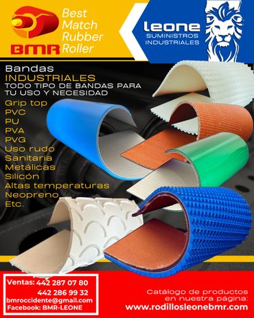 BANDAS INDUSTRIALES. Todo tipo de bandas industriales. Grip Top, neopreno, PVC, silicón, PU, PVA, PVG, uso rudo, grado alimenticio, altas temperaturas,, etc.